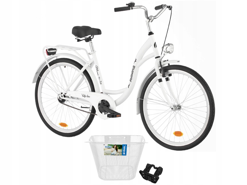 Rower miejski INDIANA Moena S1B 26 cali damski Biały + Koszyk na rower VÖGEL VKS-102WH Stalowy